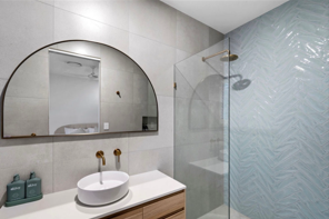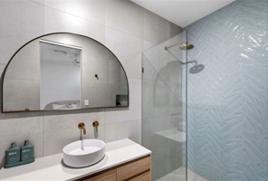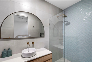 Modern bathroom with a round mirror, white sink, and glass shower enclosure with a blue textured wall.