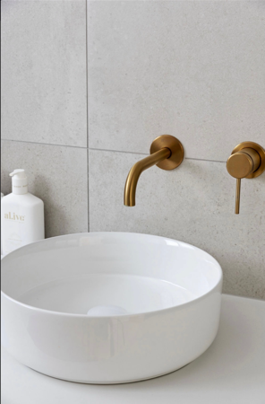 Bathroom sink with brass faucet and a bottle of hand soap on a light gray tiled wall.