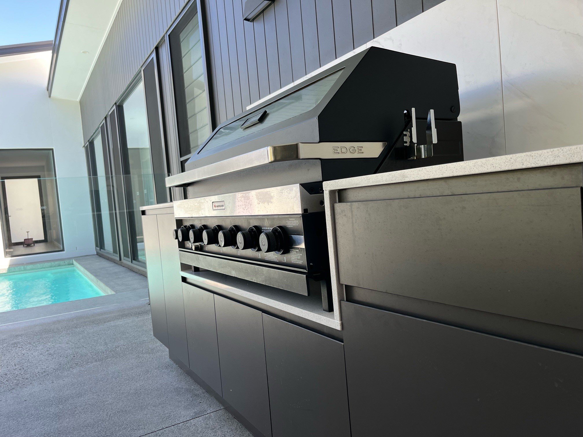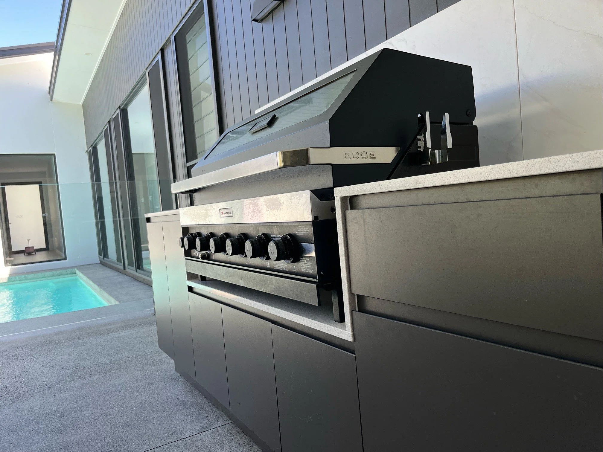 Modern outdoor kitchen with a black and stainless steel gas grill, built into a gray countertop, situated outside a house with large glass windows and swimming pool.