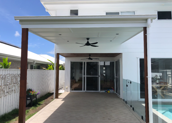Back porch with a glass safety barrier, ceiling fans, and a sliding glass door leading into a house, under a covered patio, next to a pool.