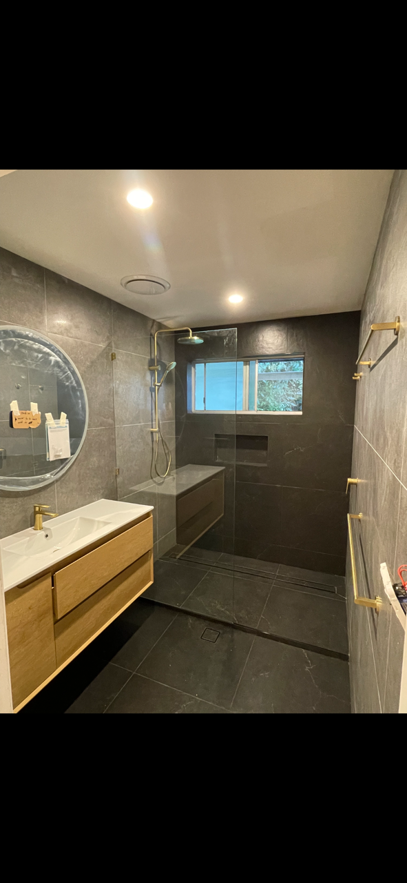 Modern bathroom with dark gray tiles, a wooden vanity with a white sink, a round mirror, gold fixtures, and a glass partition. Open doorway shows a light-colored wooden floor.