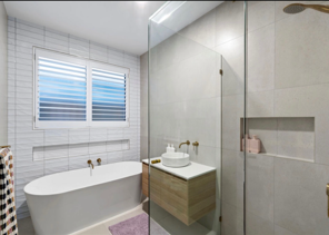 Modern bathroom with a free-standing bathtub, a window with blinds, a glass shower enclosure, and a floating vanity with a sink.