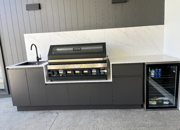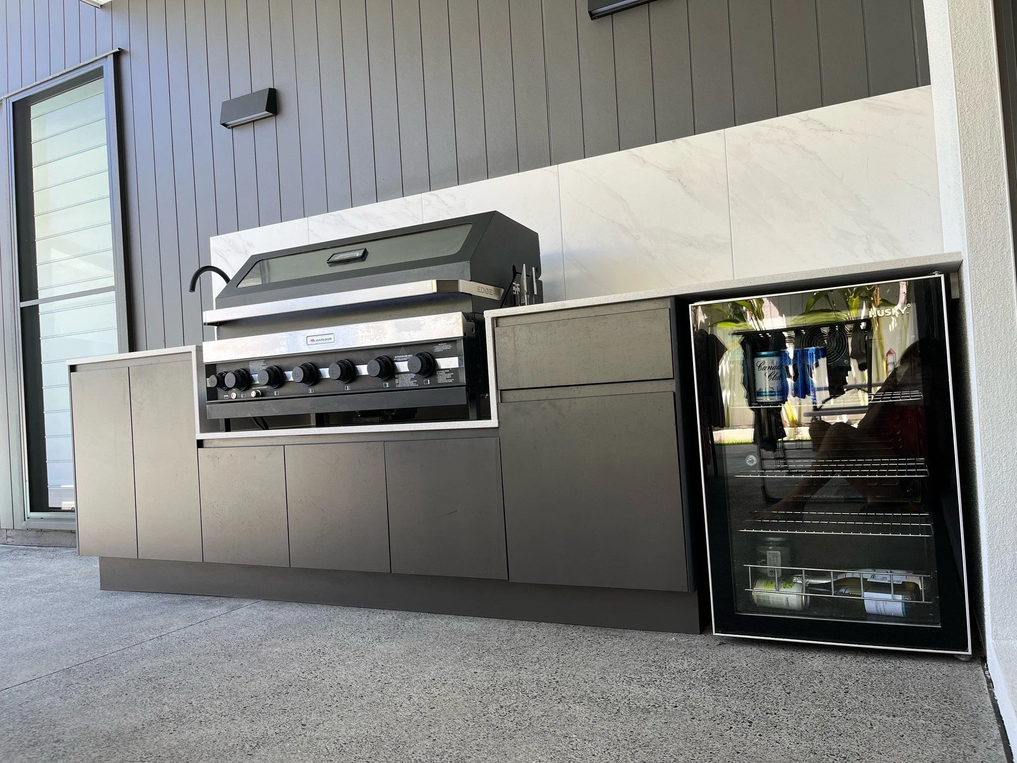 Outdoor kitchen with a grill and a mini fridge, located on a patio in front of a modern house.