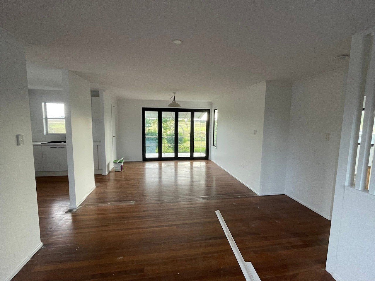 Interior view of a house under renovation, showing wooden wall framing in progress, a worker, and a living area with furniture covered in plastic sheets near sliding glass doors.