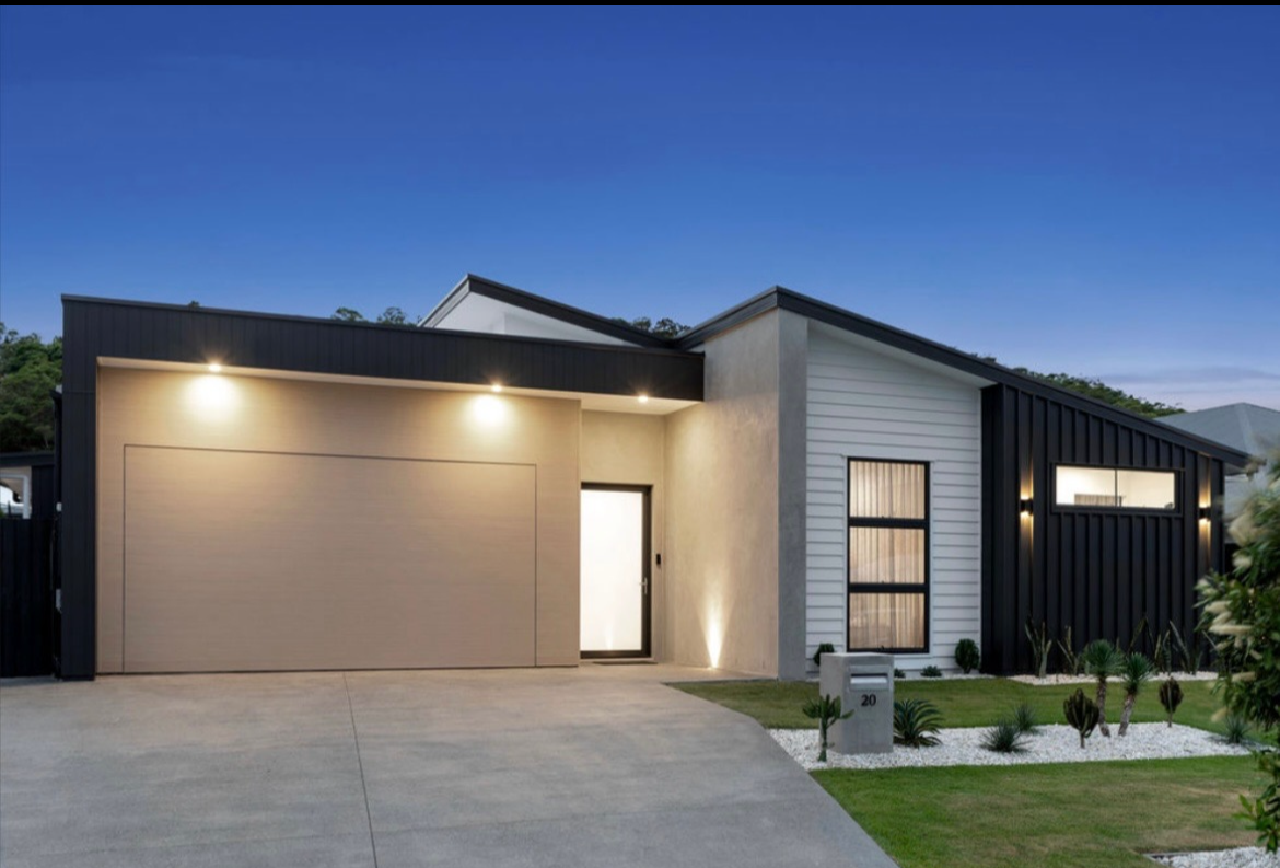 Modern house with a two-tone exterior, lit entryway, and landscaped front yard during dusk.